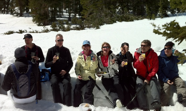 With the warm weather continuing into the early week, we arranged a mountain picnic for Alta Lodge guests. Guests skied to a snow covered meadow location from the Sugarloaf lift. It was a fun gathering and part of our annual spring celebration.